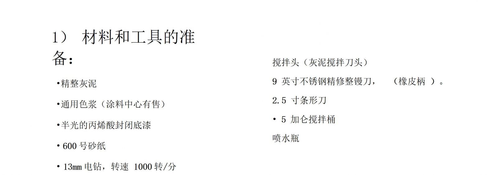 2) 攪拌灰泥、水和色料 將一份灰泥加入兩份水中, 其稠度應(yīng)該相當(dāng)于軟性冰激凌或者布丁稠度。 在達(dá)到所需要 的稠度后, 根據(jù)實(shí)驗(yàn)結(jié)果添加色料。 采用鉆頭攪拌器充分混合。 攪拌過(guò)度可能導(dǎo)致灰泥干燥速度過(guò)快;而攪拌不足則可能導(dǎo)致灰泥的使用性能差、或者出現(xiàn)塊狀灰泥。因此,生產(chǎn)廠商對(duì)攪拌過(guò)程作了特別說(shuō)明,灰泥的生產(chǎn)廠商規(guī)定: 采用13mm鉆頭,其轉(zhuǎn)速為900到1000轉(zhuǎn)/分,配合使用籠式灰泥攪拌器。廠商的說(shuō)明內(nèi)容可能略有不同,請(qǐng)嚴(yán)格執(zhí)行有關(guān)說(shuō)明內(nèi)容。值得注意的是,灰泥干燥之后的顏色會(huì)比正在粉刷的時(shí)候淺很多。